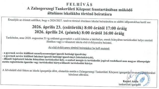 Felhívás - Beiratkozás a 2026/2027-os tanévre