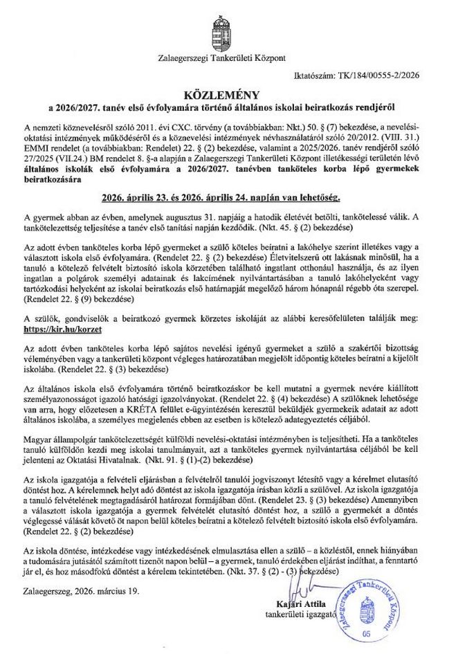 Közlemény - Beiratkozás a 2026/2027-os tanévre